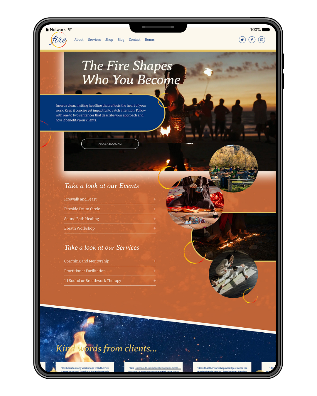 Fire has a bolder, mysterious flavour, with a spiritual theme. The home page showcases video clips to catch the eye, particularly suited to teaser snippets that demonstrate events or services. These could easily be switched with images if preferred.