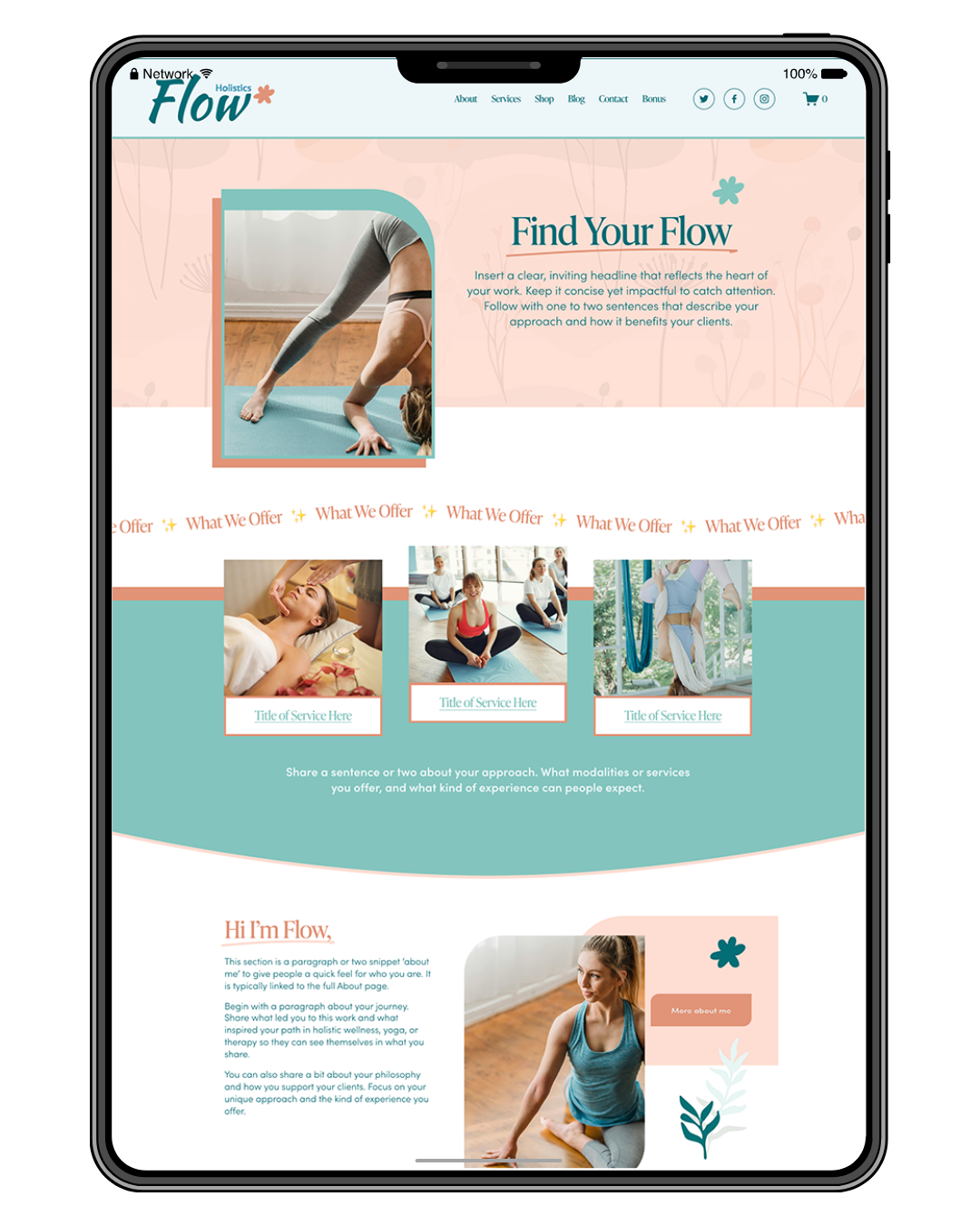 Flow is designed with a yoga practitioner theme, but can be suited for any holistic and wellness brand. The curved stylised frame edges and section dividers offer a soft and flowy aesthetic.
