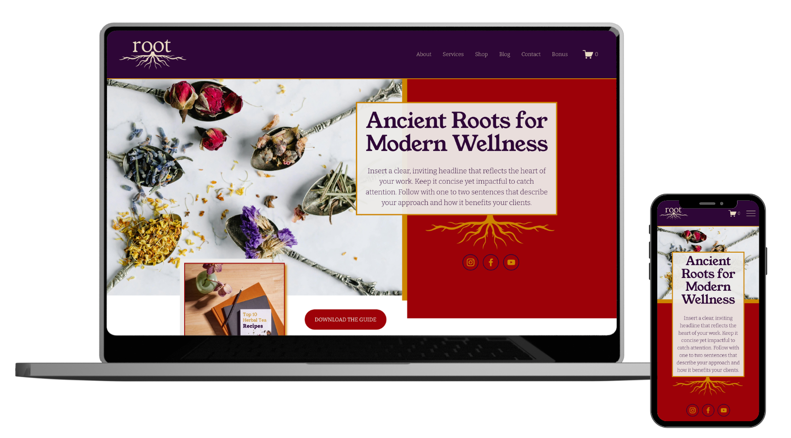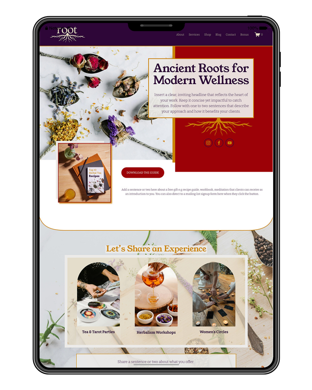 Root has an earthy, spiritual vibe, with a holistic focus. The tones are bold and rich, perfect for holistic practitioners and spiritual coaches who want to make a bold impact. This template would also suit a darker colour scheme.