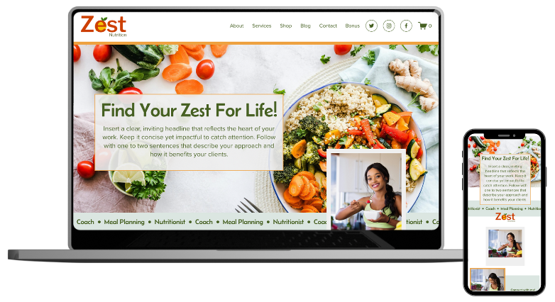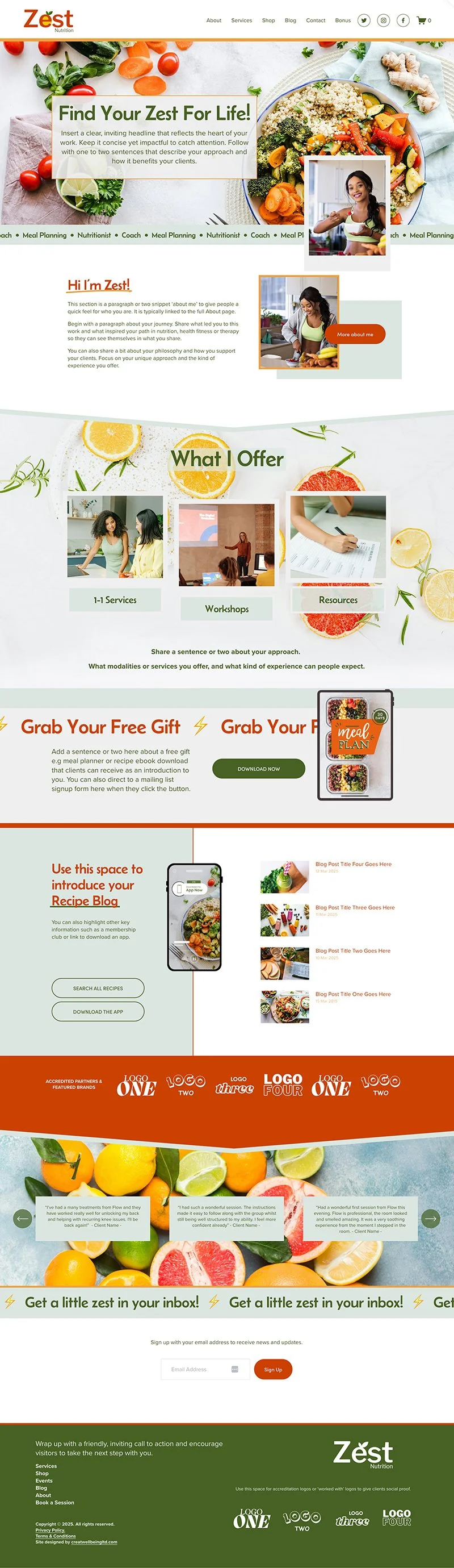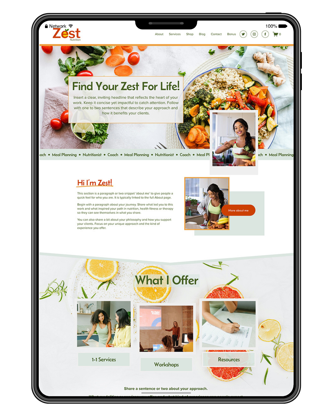 Zest is bold and bright and designed with a food focussed theme, perfect for nutritionists and health coaches, but can be customised to any brand that features bold imagery or photography to bring it to life.